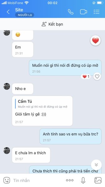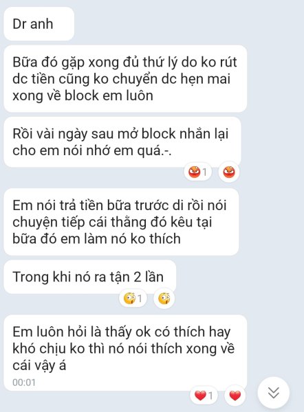 Chuyện gì đến cũng đã đến. Khi xong việc lại văn vở cũ. Tài khoản k chuyển đc. Tiền mặt k đủ. Dù em nó đã sale xuống còn 1M. Hẹn về nhà sẽ chuyển và Block e ấy luôn.